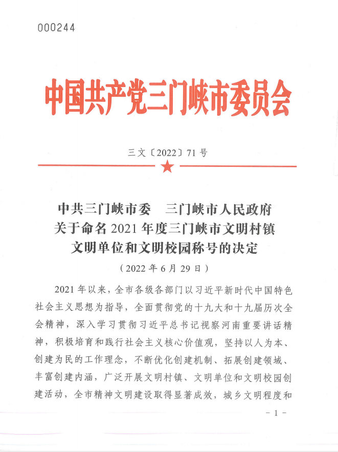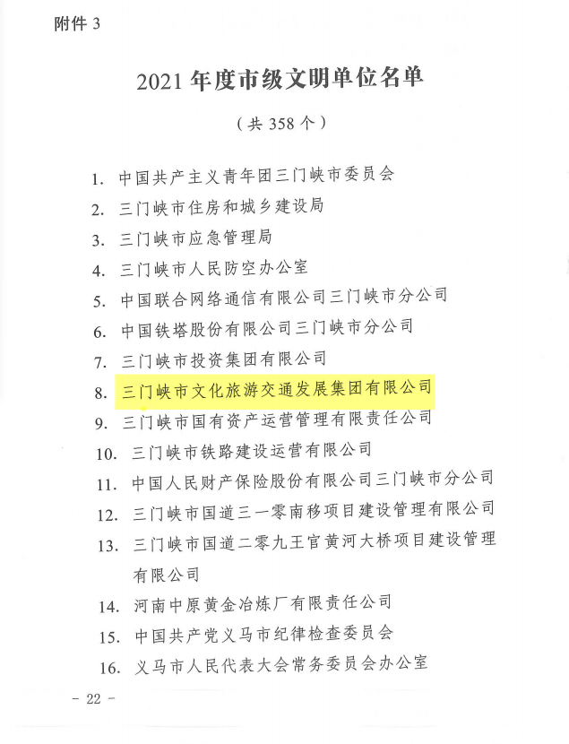 近日,三門峽市委、市政府印發(fā)《關(guān)于命名2021年度三門峽市文明村鎮(zhèn)、文明單位和文明校園稱號的決定》(三文〔2022〕71號),市文旅集團榮獲“2021年度市級文明單位”稱號。
